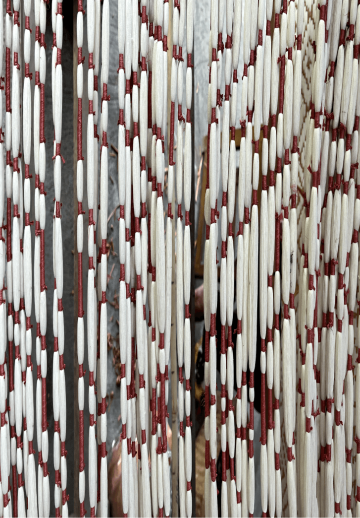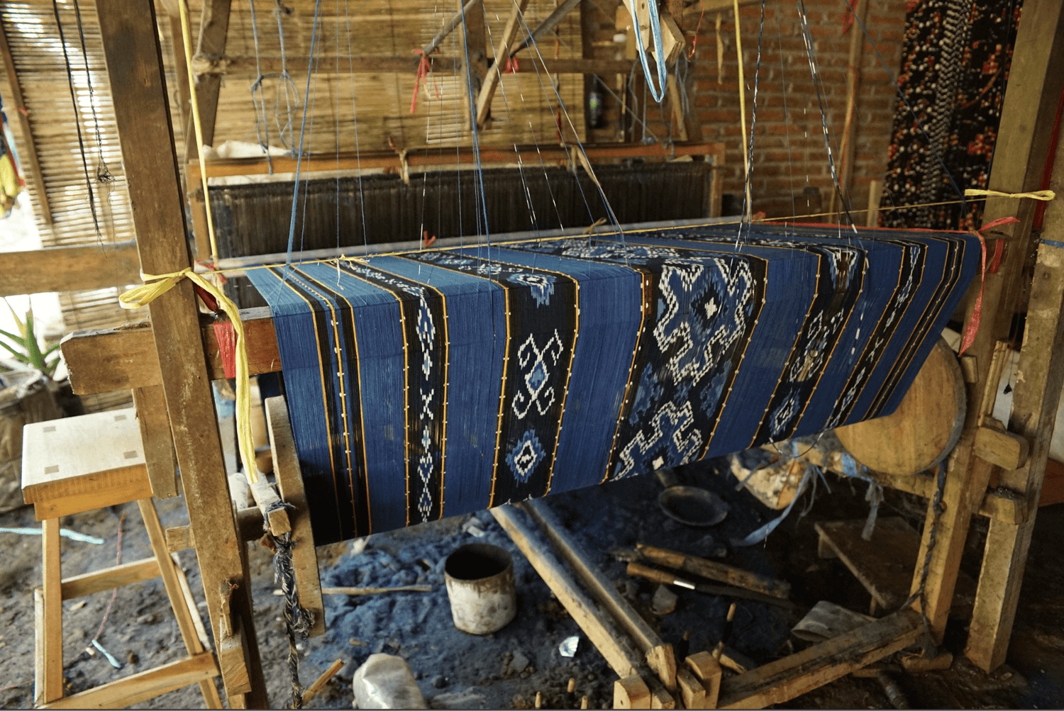 Wzór składający się z tysięcy pofarbowanych nici osnowy osadzony na krośnie jest gotowy do finalnego procesu tkania. Drobne przesunięcia nici tworzą delikatnie rozmyty, dwustronny wzór. Motywy na tkaninach często mają symboliczne znaczenie, odzwierciedlając lokalne wierzenia, tradycje i historię. Tradycyjnie ikat był używany do ceremonii rytualnych, a także jako symbol statusu społecznego.