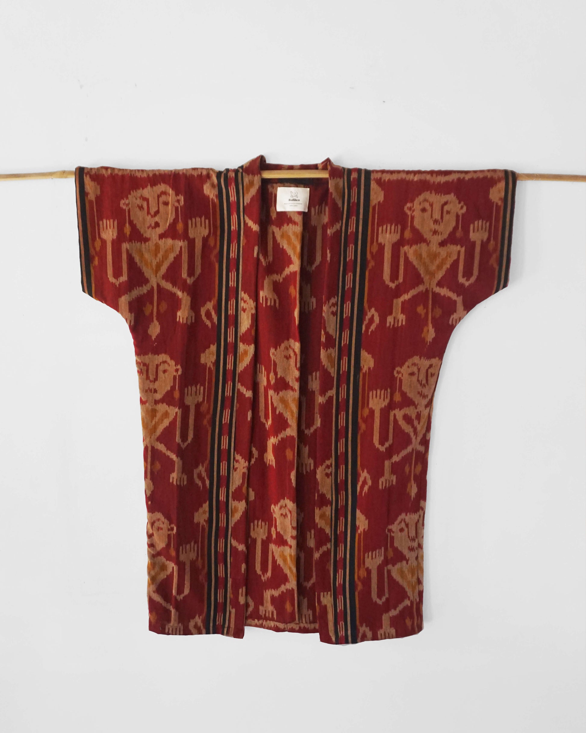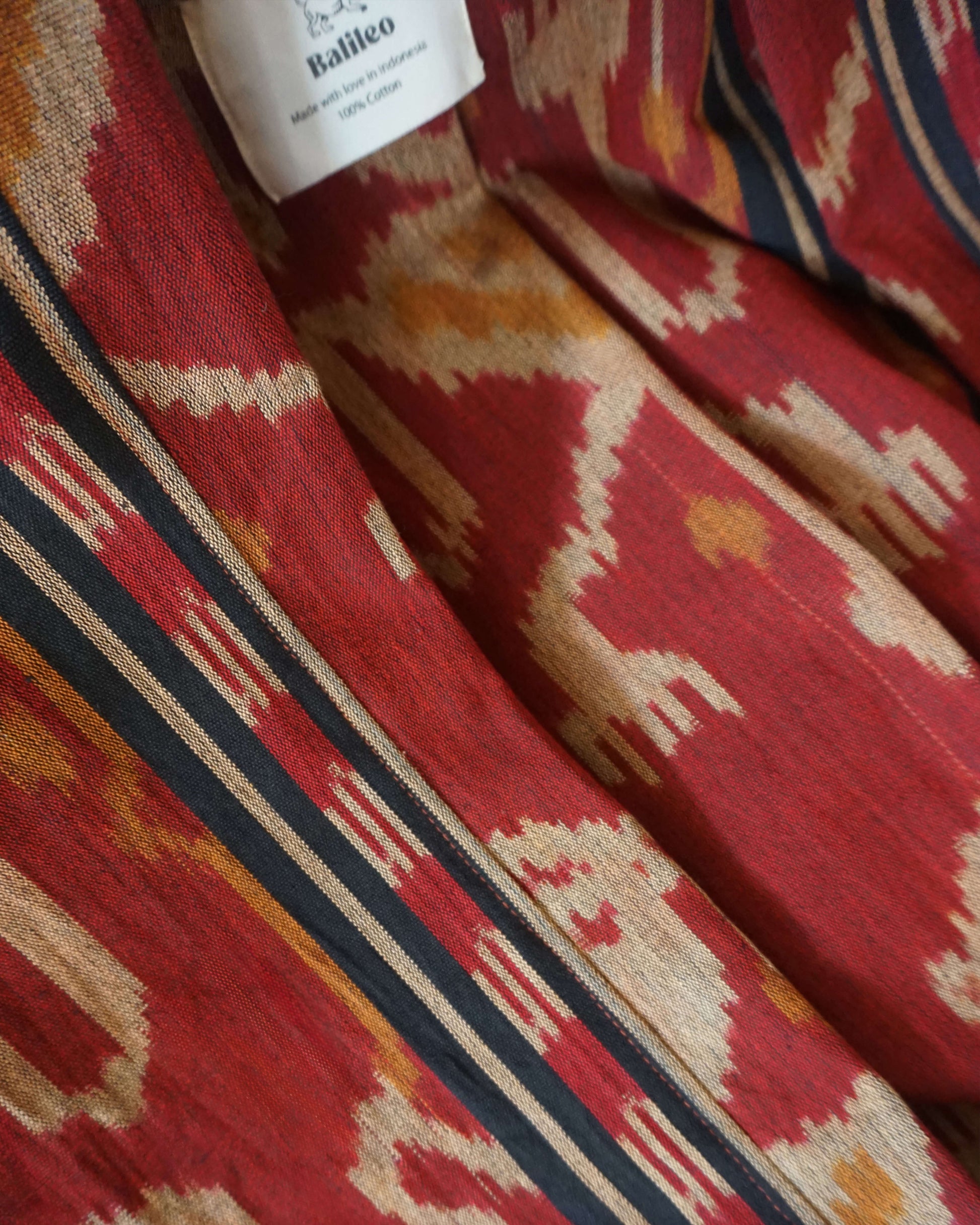 Tkanina z której uszyte jest kimono powstaje tradycyjną metodą na krośnie, dlatego nie ma dwóch takich samych. Każde jest wyjątkowe, ma swoją duszę i niepowtarzalny ślad ludzkiej ręki. Materiał jest przewiewny, a jego grubsza tekstura sprawia, że świetnie sprawdza się w chłodniejsze dni i letnie wieczory. Kimona szyjemy na Bali u wspaniałego lokalnego krawca, są dostępne w uniwersalnym rozmiarze. Zamówienie zapakowane jest w bawełniany, ochronny woreczek Balileo.